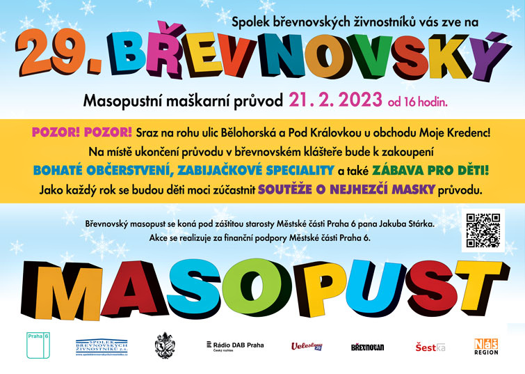 Zveme Vás na tradiční 29. břevnovský masopust, průvod vyrazí Břevnovem v úterý 21. února 2023 a i letos bude vycházet od křižovatky Bělohorská - Pod Královkou (u Kredence). Sraz masek je v 15.45. V 16 hodin bude uděleno masopustní právo zástupcem MČ Praha 6 a průvod se vydá za náležitého veselí masek i ostatních občanů na svoji cestu po Bělohorské třídě až do Břevnovského kláštera.