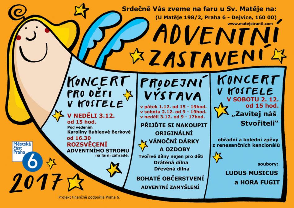 Farnost sv. Matěje srdečně zve na jedenáctý ročník Adventního zastavení - adventní trhy na faře a koncerty v kostele sv. Matěje. Můžete si zakoupit vánoční dárky a ozdoby od českých prodejců a řemeslníků, které jinde nekoupíte. Čeká na Vás dřevěná dílna s výtvarnicí a scénografkou Bárou Hubenou a drátěná dílna s architektkou Hankou Řepkovou - výrobou andělů, betlémů apod., dále bohaté domácí slané i sladké občerstvení ( guláš vařený na ohni na dvoře, domácí koláče, káva čerstvě namletá atd.) - s možností posezení uvnitř i venku. Malá adventní výstava, adventní zamyšlení.