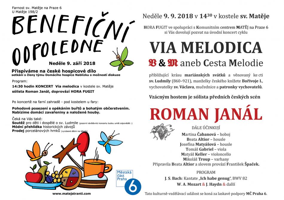 Benefiční nedělní odpoledne v kostele na zahradě fary sv. Matěje. Koncert s předním sólistou Romanem Janálem a pohodové posezení s opékáním buřtů, soutěžemi, nabídkou domácích zavařenin a bohatým občerstvením.