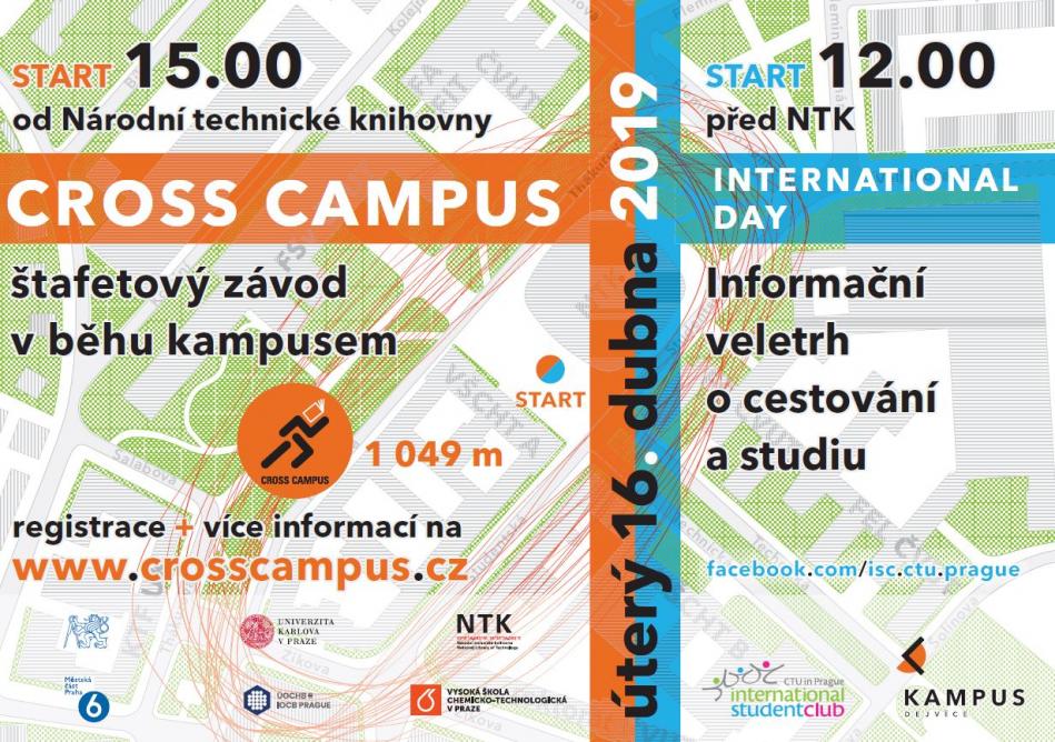 Cross Campus je štafetový běh studentů a zaměstnanců zdejších vysokých škol a institucí, kdy každý z čtyřčlenného týmu uběhne jeden kilometr. Startujeme před NTK, běží se Studentskou a Zikovou ulicí, parkem Indiry Gándhiové, podél Fakulty stavební, Fakulty architektury a odtud zpět k NTK.