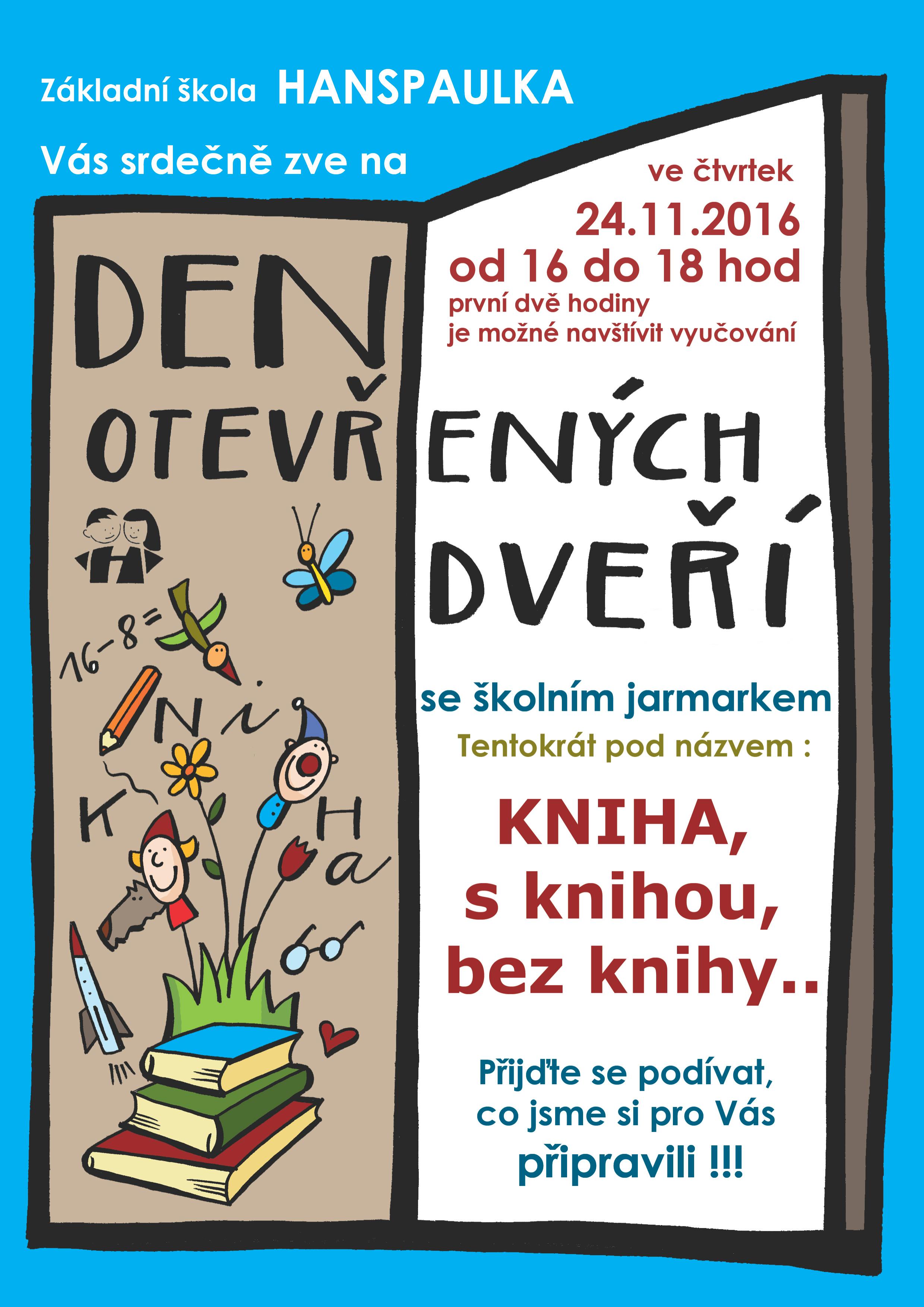 Ve čtvrtek 24.listopadu se koná tradiční Den otevřených dveří v ZŠ Hanspaulka. Během dopoledne je možné navštívit výuku, program je připraven v době od 16 do 18 hodin