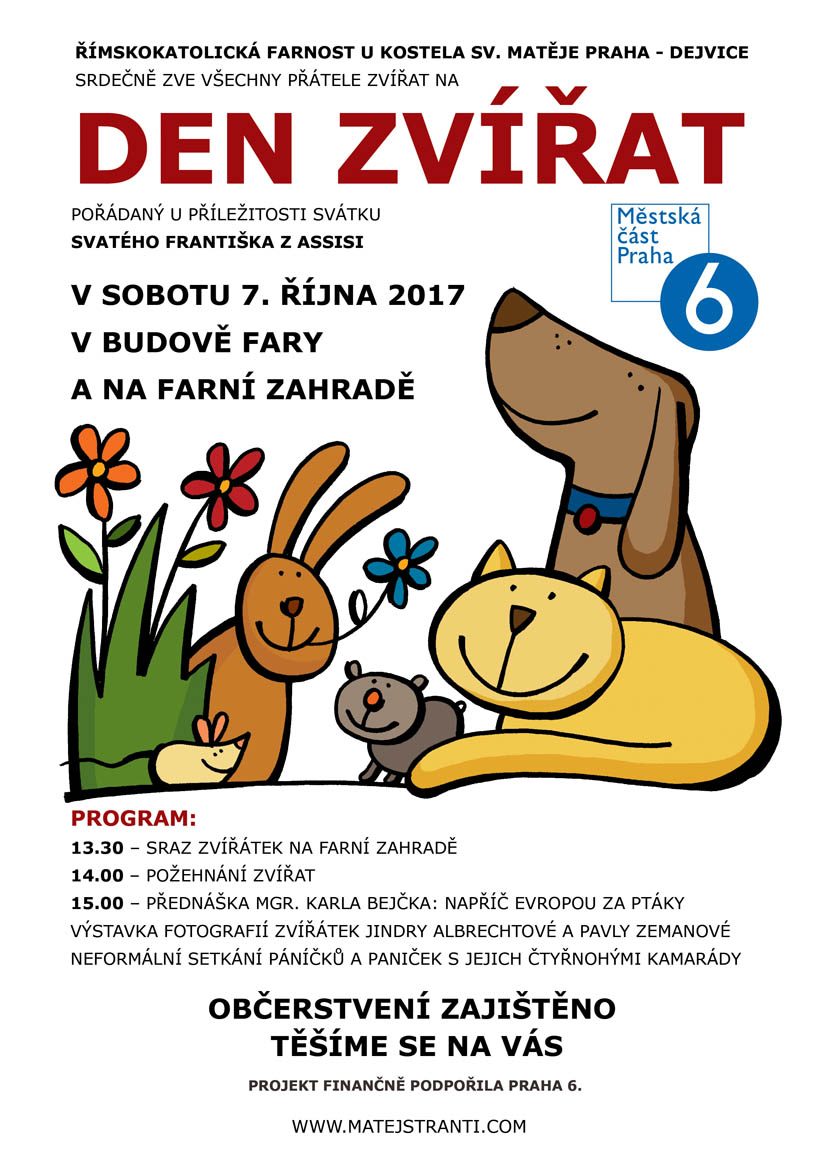 Farnost sv. Matěje srdečně zve na akci Den zvířat pořádanou u příležitosti svátku sv. Františka, patrona zvířat, na farní zahradě a v budově fary.