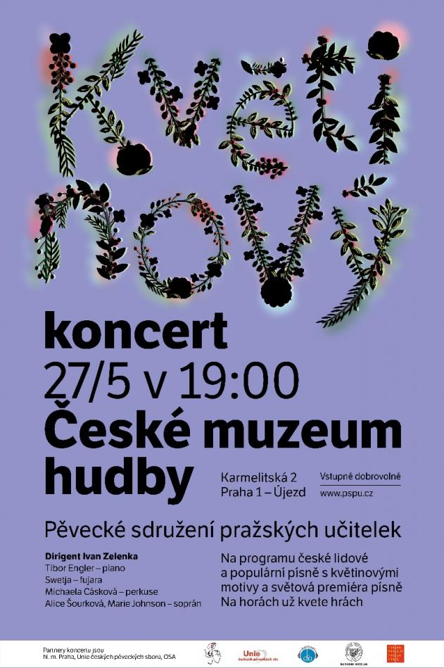 Květinový koncert v pondělí 27. května 2019 od 19:00 v Českém muzeum hudby - Karmelitská 2/4, Praha 1 - Újezd, tram 15, 20, 22 - Hellichova. Zazní rozkvetlé písně lidové i populární - například: Když jsem kytici vázala, Chlupatý kaktus, Slunečnice, Rozmarýn, Šípek, Věneček, Vlčí máky, Čepení, Červená růžičko rozvíjej se, Svatojánská muška i slavné verše Seifertovy "Krásná jako kvítka na modranském džbánku..."