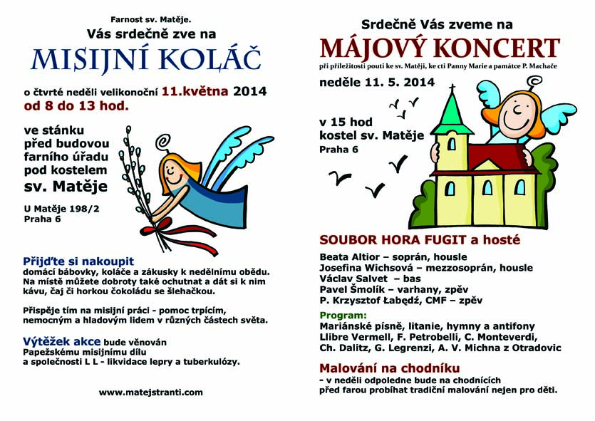 V neděli 11. května - Májový Mariánský koncert od 15 hod v kostele sv. Matěje a Misijní koláč od 8 do 13 hod - prodej domácích koláčů, bábovek apod.k nedělnímu obědu.