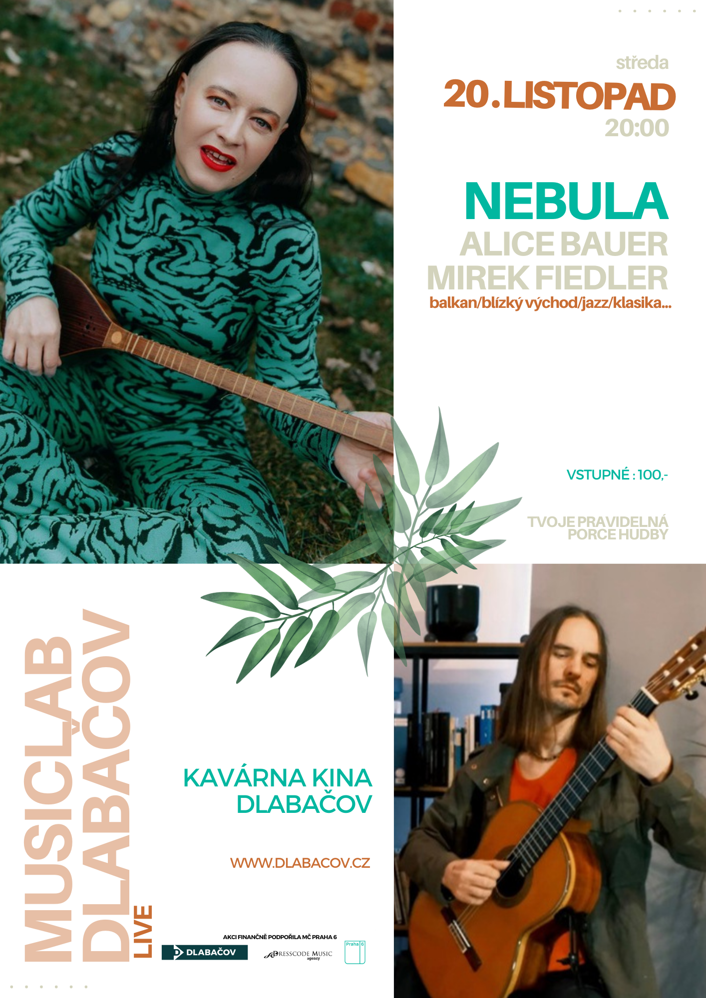 Koncert v kavárně kina Dlabačov v rámci pravidelné otevřené živé hudební scény Musiclab Dlabačov. Nebula je autorský projekt, jehož inspirace je širokospektrální – od mikrotonální lidové a klasické hudby blízkého východu a střední Asie přes jazz, blues, klasickou evropskou hudbu až po rock etc. Cílem je zůstat věrni představě proměny v čase a mimo škatulky. Jádro obsazení tvoří Alice Bauer (zpěv, klávesy) a Miroslav Fiedler (kytary, zpěv) a pro různé příležitosti je doplňováno hosty.
