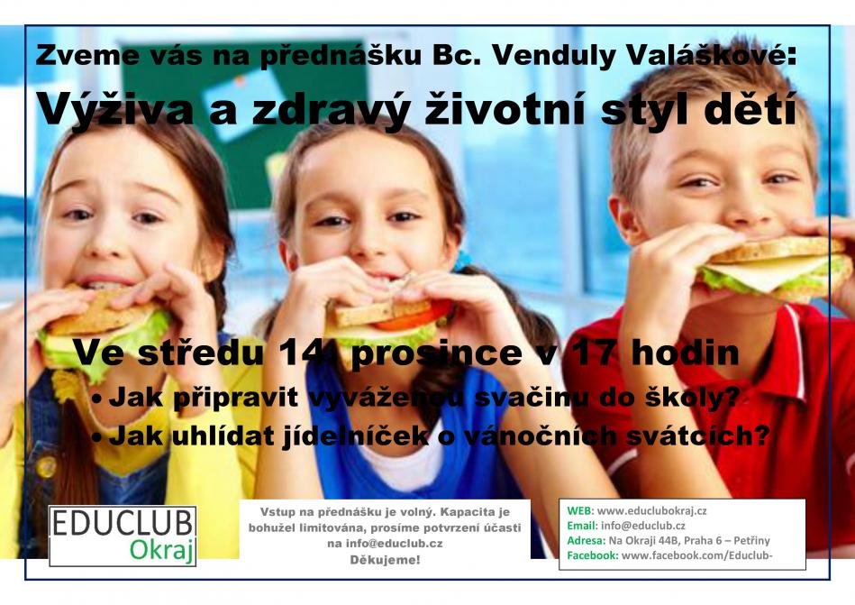 Zajímá vás jak připravit vašim dětem zdravou a vyváženou svačinu do školy? A jak doladit stravu doma v závislosti na jídelníčku ve škole? Potom přijďte na přednášku ve středu 14.12 v 17 hodin do Educlubu. Přivítáme u nás výživovou poradkyni Bc. Vendulu Valáškovou, která bude po přednášce odpovídat i na vaše konkrétní dotazy.