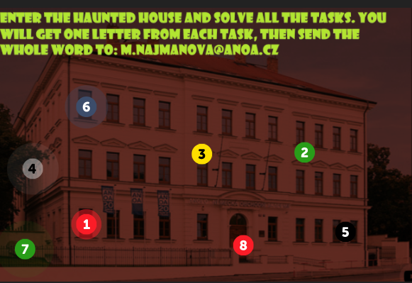 Vzhledem k tomu, že nám letos z důvodů uzavření škol nevyjdou oslavy Halloweena ve školách jak jsme zvyklí, rozhodli jsme se vytvořit on-line strašidelný dům, kde budou moci studenti plnit různé úkoly. Po splnění každého úkolu dostane student jedno písmeno.