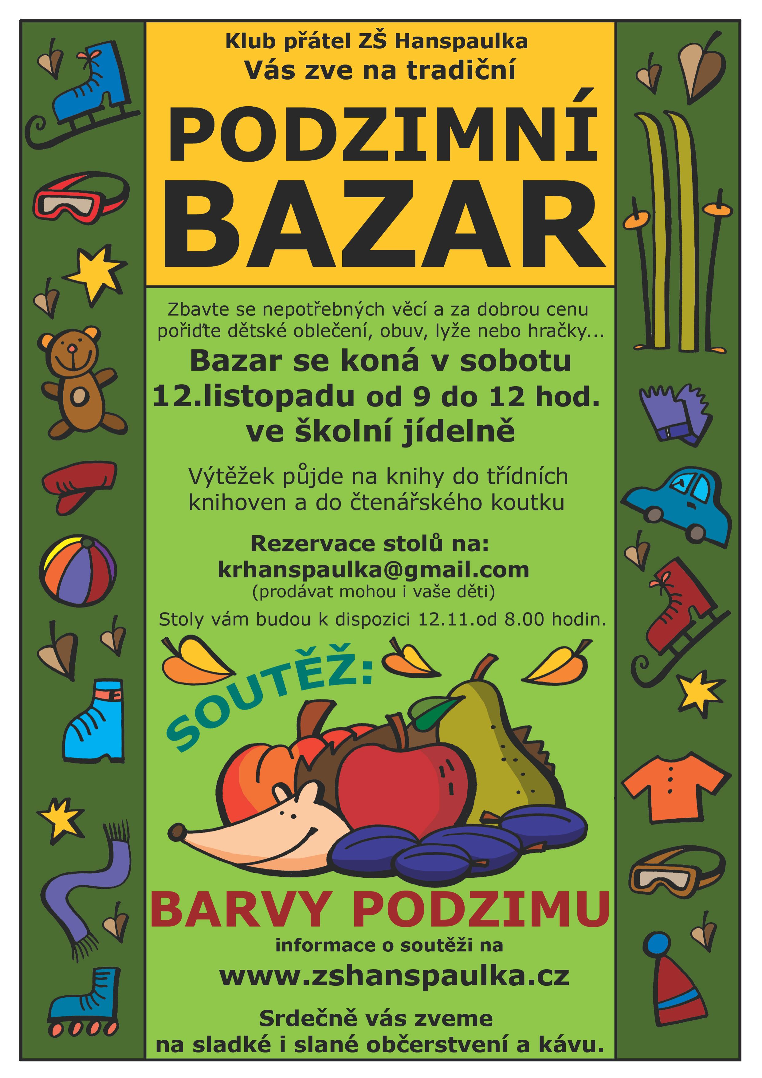 Tradiční podzimní bazar, který pořádá Klub přátel ZŠ Hanspaulka se koná v sobotu 12.11. od 9 do 12 hodin ve školní jídelně ZŠ Hanspaulka