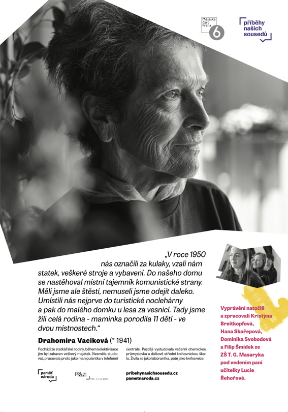 Žákovské týmy v Praze 6 již potřetí objevovaly příběhy svých sousedů a tentokrát na kameru či diktafon zaznamenaly celoživotní vzpomínky třinácti z nich. Mezi vyzpovídanými pamětníky nechybí zástupci nejstarší generace: Helena Brabencová, Vladimír Kolomý, Igor Pleskot a Pavel Jeník, kteří pamatují nacistickou okupaci a boje v závěru války, či lidé perzekvovaní komunistickým režimem: Jiří Navrátil, Iva Vodrážková a Drahomíra Vacíková. Žáci se také setkali s Olgou Bojarovou a Petrem Horou Horejšem, spisovateli, kteří se v minulém režimu nesměli publikovat, s představitelem hudebního undergroundu Jaroslavem Jeronýmem Neduhou, či s Jiřím Všetečkou, který se svým fotoaparátem zachytil sovětskou okupaci i Palachův pohřeb. Svůj životní příběh dětem vyprávěli také akademická sochařka Dagmar Kolumková a restaurátor Václav Kadlec. Výstava v Písecké bráně ve formě velkoformátových fotografií s autentickými výpověďmi vychází z nahrávek pořízených od září 2015 a představuje všechny jmenované osobnosti. K vidění bude od 6. září do 2. února každý den kromě pondělí mezi 11 a 19 hodinou.