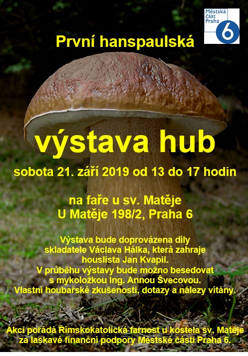 Výstava hub na faře spojená s poradnou a besedou mykoložky ing. Anny Švecové a hudebními díly skladatele Václava Hálka, která zahraje houslista Jan Kvapil.