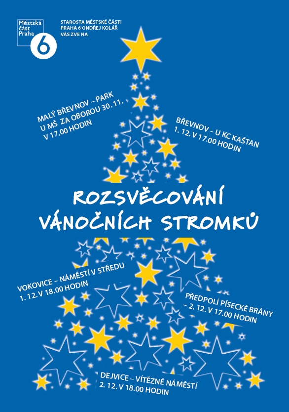 Starosta městské části Praha 6 Ondřej Kolář vás zve na rozsvěcování pěti vánočních stromů, které budou probíhat od pátku 30. listopadu do neděle 2. prosince.