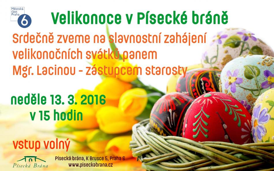 Přijďte s námi oslavit velikonoční svátky. Velikonoční svátky v Písecké bráně slavnostně zahájí pan Mgr. Jan Lacina, zástupce starosty MČ Praha 6, zazpívají děti ze Sedmihlásku, dojde i na upálení Morany a přivítání jara.