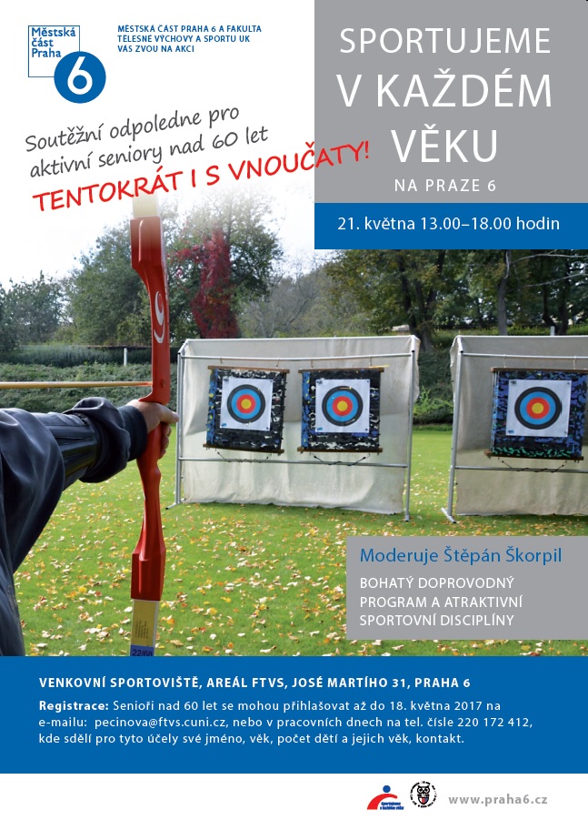 Městská část Praha 6 pořádá 21. 5. od 13 hod ve spolupráci s FTVS tradiční akci Sportujeme v každém věku. Na základě předchozích úspěšných ročníků se akce nyní nově koná i na jaře a je zaměřena mimo jiné na propojení dvou generací - na seniory a jejich vnoučata.