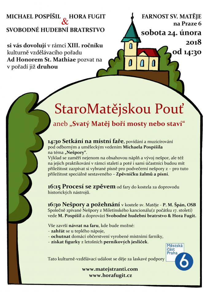 StaroMatějská pouť v kostele a na faře sv. Matěje na Hanspaulce aneb "Svatý Matěj boří mosty nebo staví". Poutní odpoledne, kde na faře čeká přednáška na téma "Nešpory", společné muzicírování a občerstvení s možností získání figurek z perníkových jesliček, půjde se také procesím do kostela.