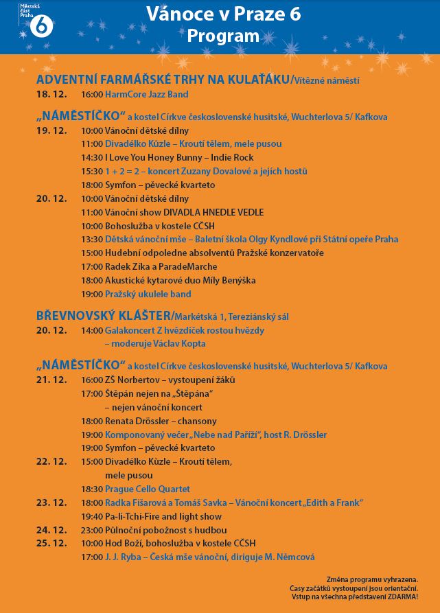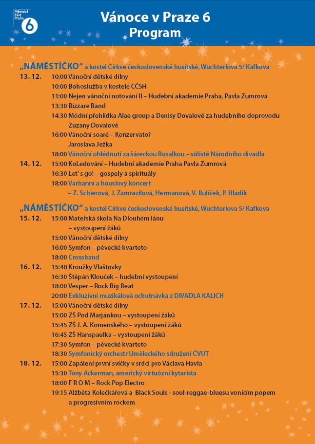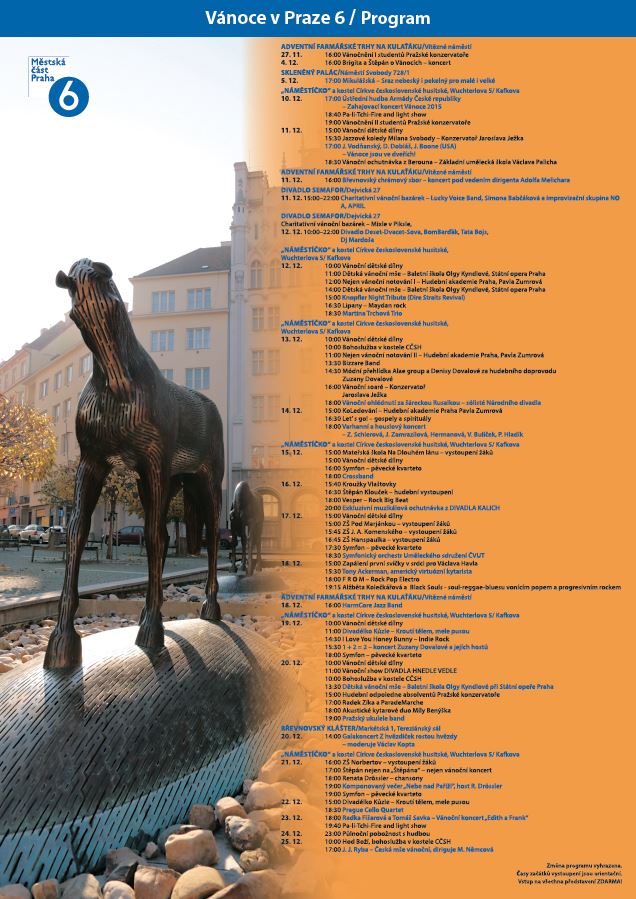 Praha 6 si pro Vás i letos připravila bohatý předvánoční program. Tentokrát se centrem oslav stane "Náměstíčko" Wuchterlova/Kafkova, kde nad fontánou s koňmi vyroste pódium a prostor vyplní stánky s vánočním občerstvením.