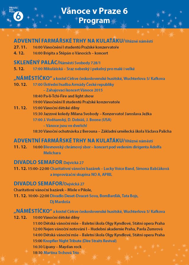 Kromě programu na Náměstíčku, vánočního galakoncertu v břevnovském klášteře nebo mikulášské nadílky ve Skleněném paláci, které MČ Praha 6 připravuje prostřednictvím oddělení kultury OŠK, finančně podpořila také páteční adventní koncerty na Farmářských trzích na Kulaťáku, v Písecké bráně a Kulturním centru Kaštan.