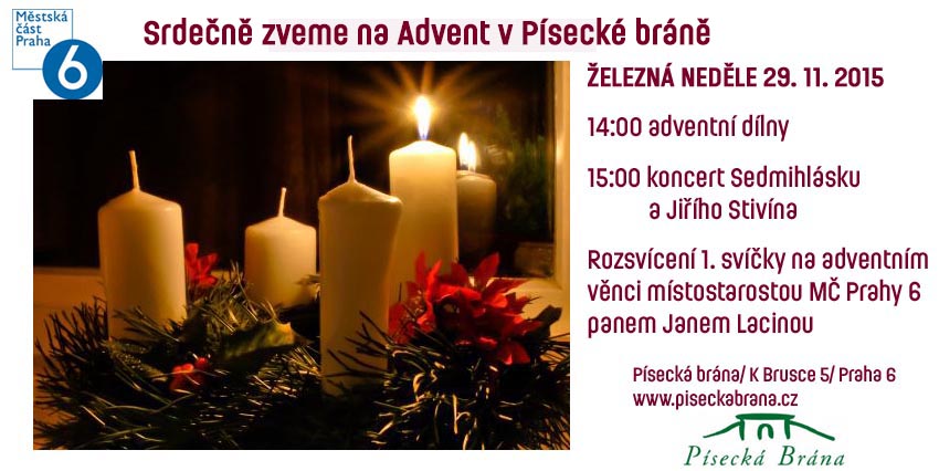 Přijměte srdečné pozvání na 1. adventní neděli do Písecké brány, kde si můžete vyrobit ozdoby, poslechnout si dětský pěvecký sbor Sedmihlásek pod vedením Hany a Víta Homérových, a také flétnistu, jazzmana a skladatele Jiřího Stivína.