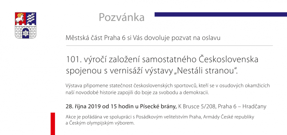 Městská část Praha 6 si Vás dovoluje pozvat na slavnostní shromáždění k 101. výročí založení samostatného Československa spojené s vernisáží výstavy „Nestáli stranou“. 28. října 2019 od 15 hodin u Písecké brány, K Brusce 5/208, Praha 6 – Hradčany.