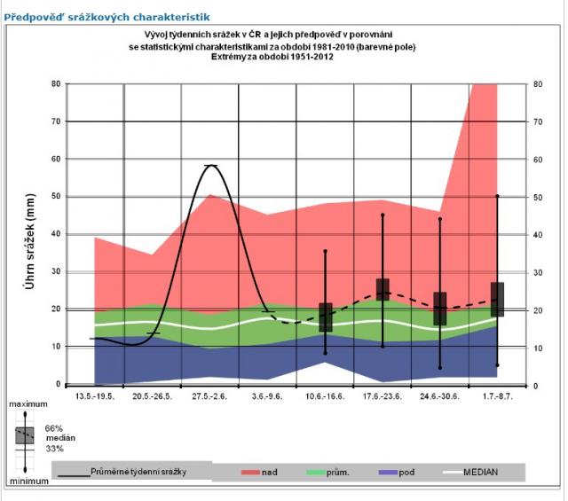 UVNITŘ ČLÁNKU ODKAZ NA KOMPLETNÍ PŘEDPOVĚĎ. Český hydrometeorologický ústav vydal předpověď na následující měsíc. Období předpokládáme jako srážkově nadprůměrné! Z následujících 4 týdnů by měl být nejteplejší ten první (10. - 16. 6.) a nejchladnější poslední červnový týden.