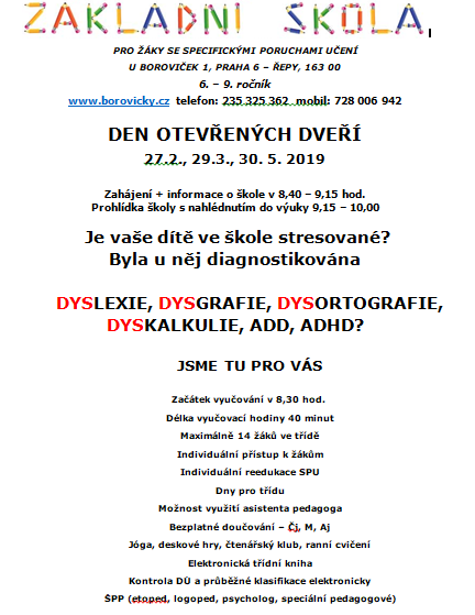 Základní škola pro žáky se specifickými poruchami učení vás zve na dny otevřených dveří, které se konají ve dnech 27.2., 29.3. a 30.5.2019.