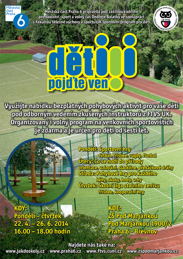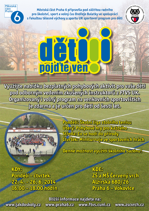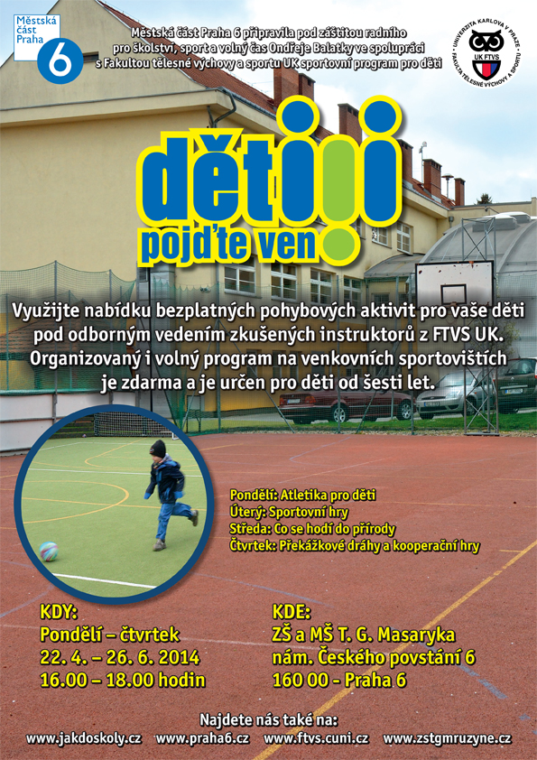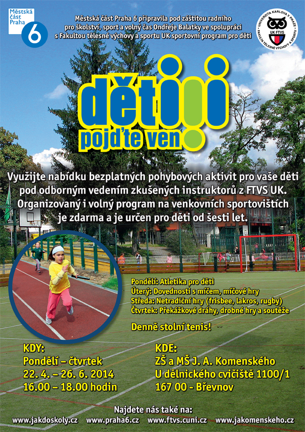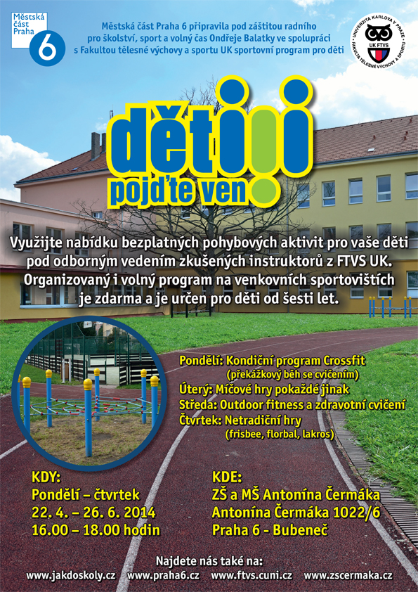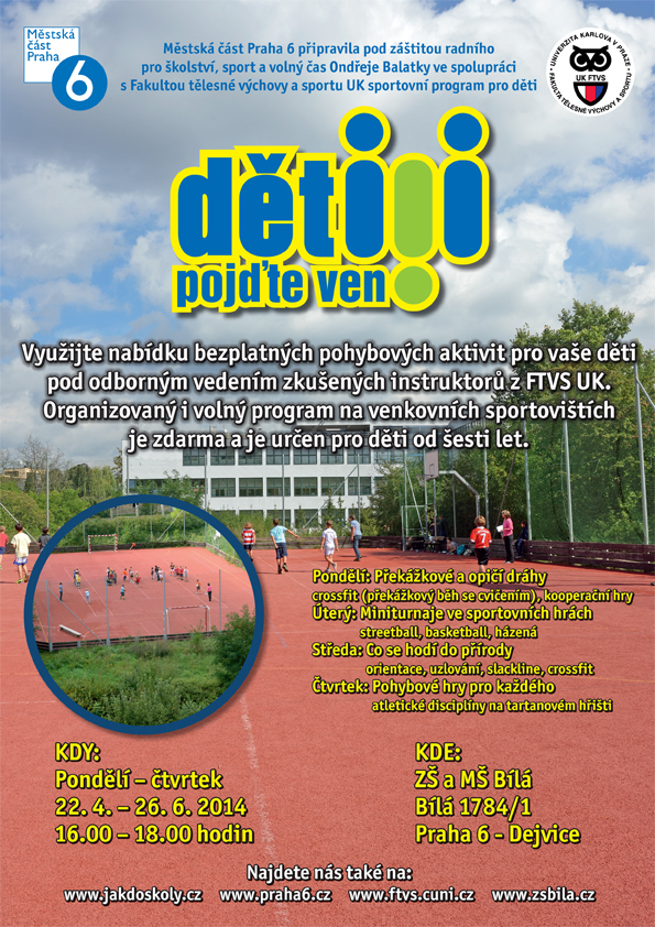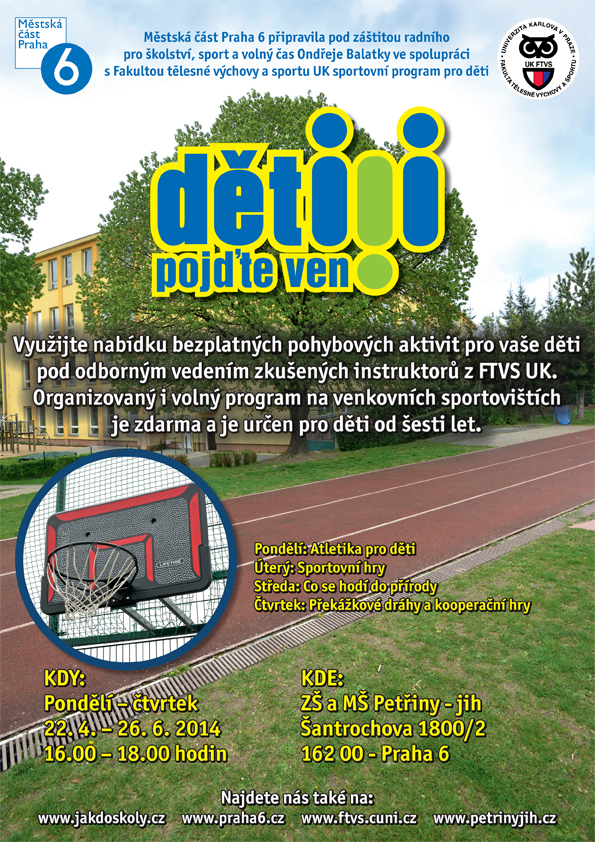 Do nejrůznějších pohybových aktivit se všechny děti mohou zapojit na venkovních sportovištích u devíti základních škol Prahy 6. „Program je alternativou a doplněním k činnosti sportovních oddílů a sportovních kroužků. Již na podzim se ukázalo, že o něj děti i rodiče mají zájem, proto jsme se rozhodli v něm na jaře pokračovat,“ říká radní pro školství Ondřej Balatka a doufá, že pestrá nabídka aktivit ke sportování tak přivede i děti, které dosud váhají a volný čas tráví raději u počítače nebo u televize.