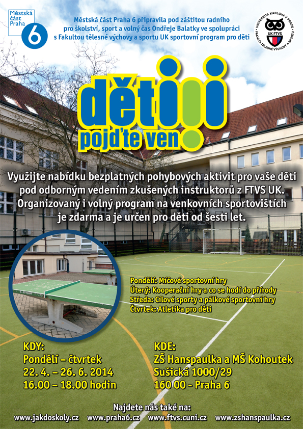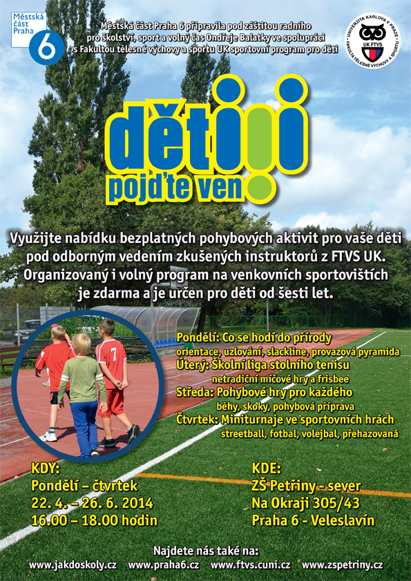 Děti ze základních škol v Praze 6 mohou opět trávit odpoledne sportem pod vedením mladých lektorů z tělovýchovné fakulty. Po zimní pauze znovu startuje projekt „Děti pojďte ven“, který vznikl ze spolupráce městské části a FTVS UK a je pro školáky zdarma.
