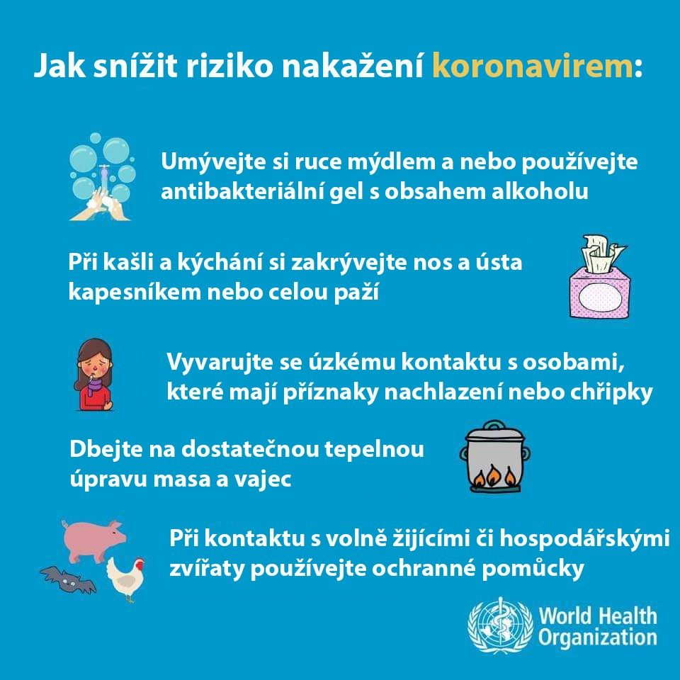 V rámci preventivních opatření provozu škol a školských zařízení doporučujeme zejména s ohledem na návrat zaměstnanců, žáků a dětí z jarních prázdnin strávených v rizikových oblastech v zahraničí, v případě projevů symptomů (teplota nad 38 stupňů C, kašel nebo potíže s dýcháním), respektovat doporučení Ministerstva zdravotnictví (zůstat doma, telefonicky kontaktovat ošetřujícího lékaře – podat informace o svém zdravotním stavu a pobytu v rizikové oblasti). Další doporučení v článku.