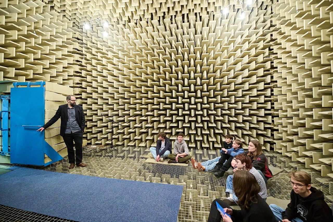 Fakulta elektrotechnická: Prohlídka bezodrazové akustické komory, návštěva dílny eForce s autonomní elektroformulí, multimediální technologie v AV studiu.