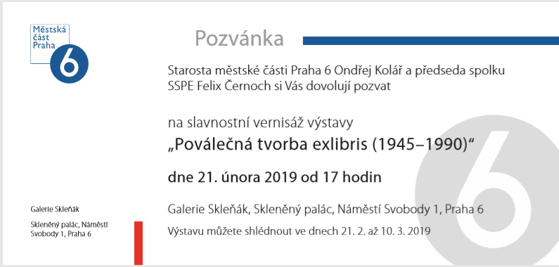 Městská část Praha 6 ve spolupráci se Spolkem sběratelů a přátel exlibris vás zvou na výstavu „Poválečná tvorba exlibris (1945 - 1990) “, která představuje expozici drobných grafik jenž vyobrazují vývojovou etapu od konce 2. světové války do roku 1990.