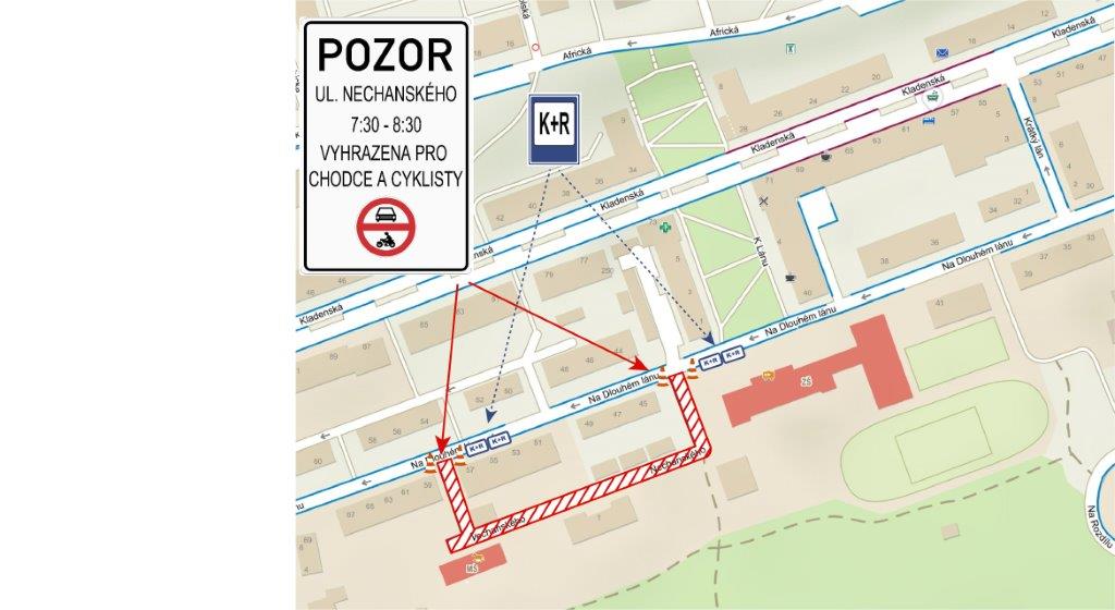 Režim školní ulice v ulici Nechanského bude zahájen 4. 4. ve dnech školního vyučování v čase 7:30–8:30. V této době se ulice dočasně změní v pěší zónu bez povoleného vjezdu motorových vozidel. Zákaz vjezdu bude proveden dopravními značkami a vymezen dopravními kužely. Výjezd z oblasti bude umožněn, stejně jako případný vjezd vozidel integrovaného záchranného systému. Pro rodiče, kteří dovážejí děti autem, budou vyhrazena parkovací stání v ulici Na Dlouhém lánu, nebo budou moci využít volné parkovací kapacity v okolí (ulici Na Dlouhém lánu, Kladenskou nebo ulici Nad Bořislavkou).