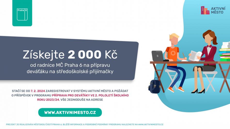 Příspěvek dva tisíce korun mohou získat rodiče žáků 9. tříd ze všech základních škol zřizovaných městskou částí Praha 6. Smyslem příspěvku je snížit stále rostoucí náklady na přípravu deváťáků na střední školy: přípravné kurzy, zkoušky nanečisto, příprava na talentovky a podobně.