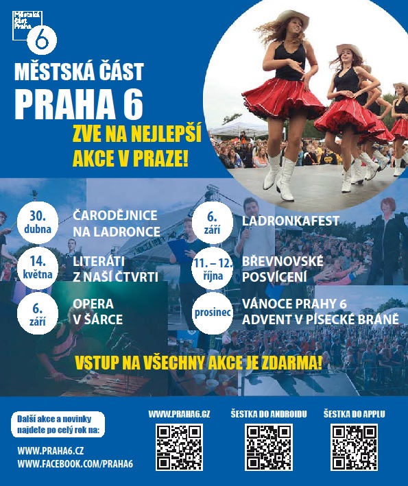 Městská část Praha 6 má pro vás i letos jedny z nejlepších akcí v Praze! Desetitisíce fanoušků, desetitisíce návštěvníků, desetitisíce těch, kterým Praha 6 děkuje za účast! I letos máme pro vás připravené jedny z nejoblíbenějších akcí v Praze! Takže diáře do ruky a poznamenejte si termíny! Těšíme se na vás. Vstup na všechny akce je zdarma!
