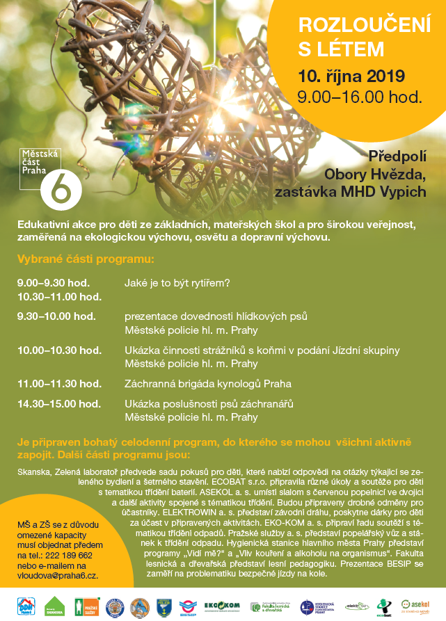 „Rozloučení s létem“ dne 10. 10. 2019 od 9:00 do 16:00 hodin. Jedná se o edukativní akci pro děti ze základních, mateřských škol a pro širokou veřejnost zaměřenou na ekologickou výchovu, osvětu a dopravní výchovu.
