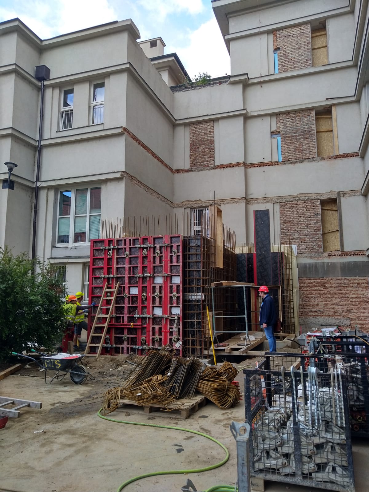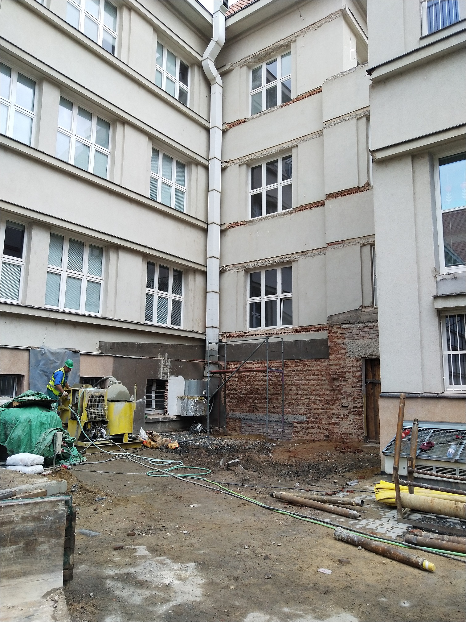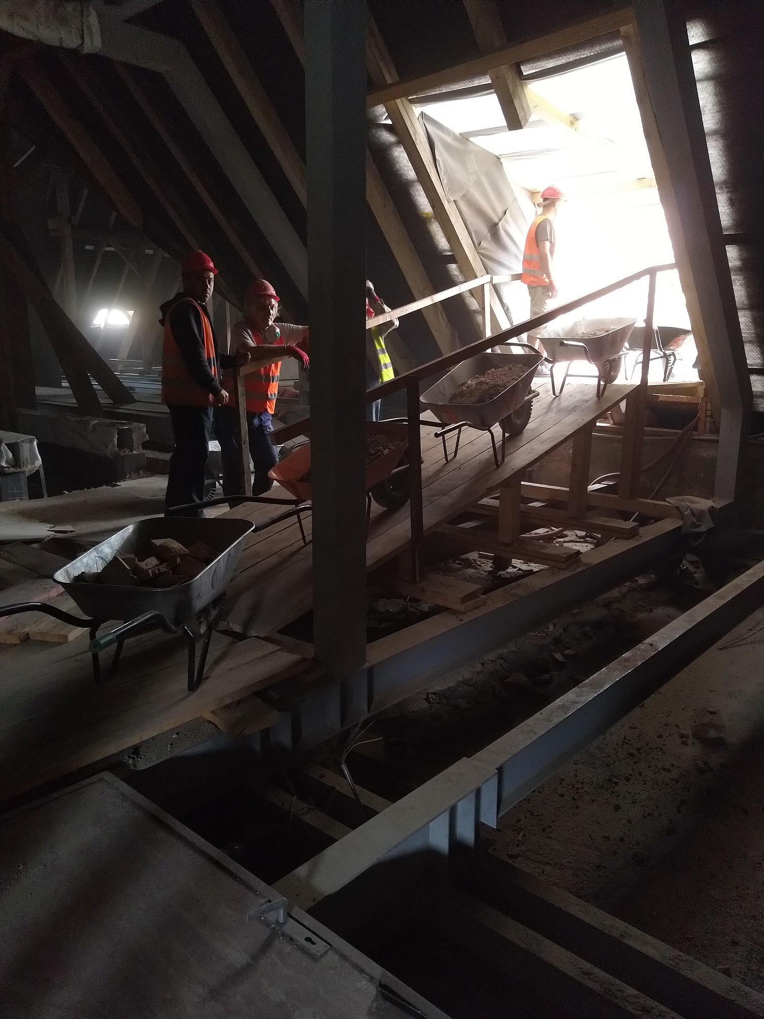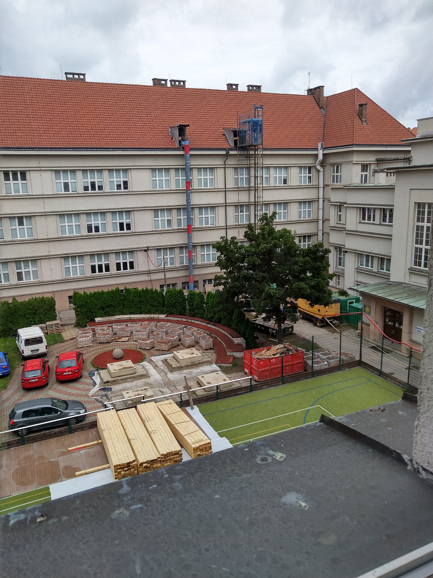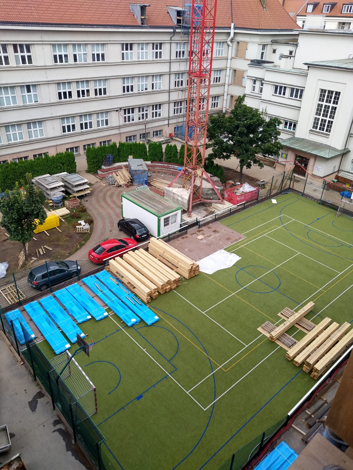 Staví se schodišťové věže, buduje se podlaha v půdě a začínáme zateplovat. Start školního roku jsme zvládli, všude bylo skvěle uklizeno.