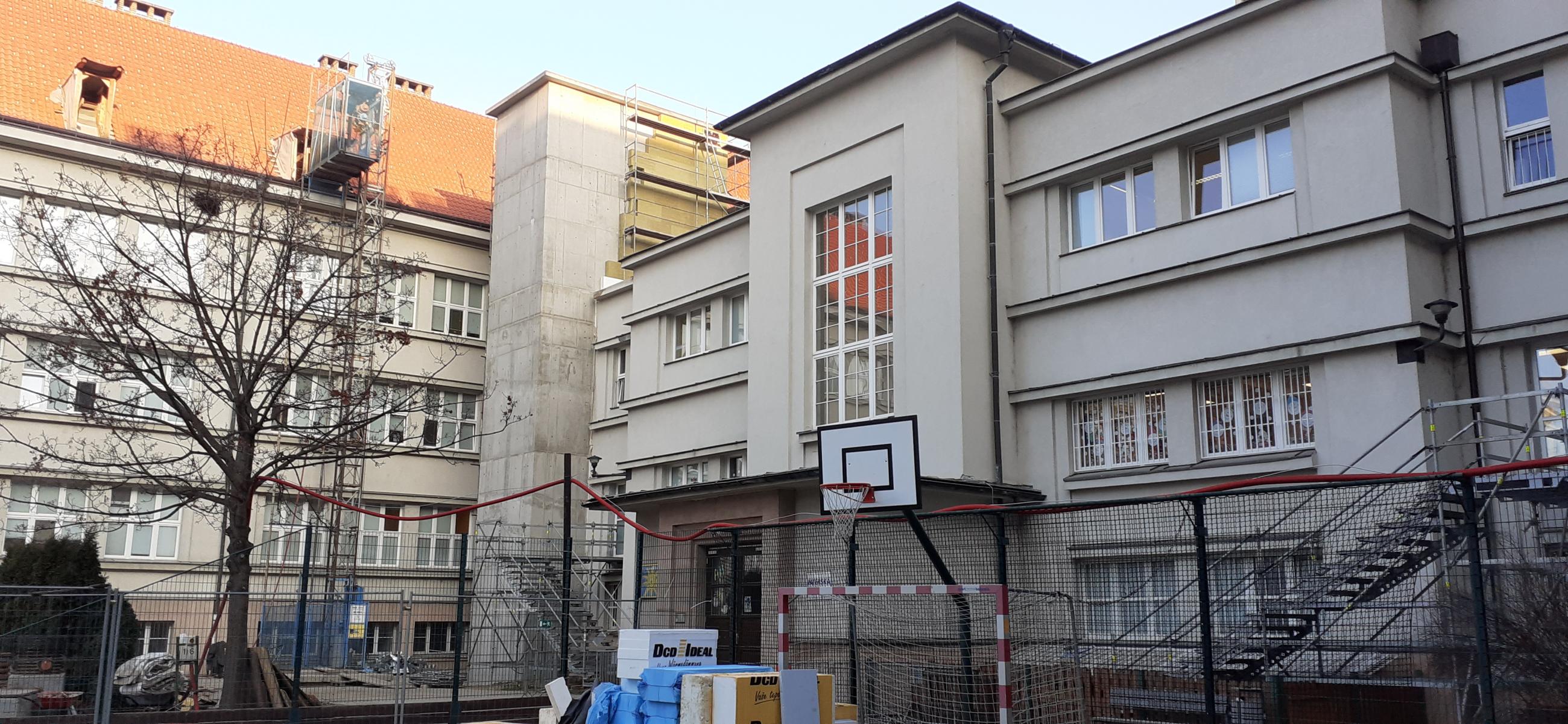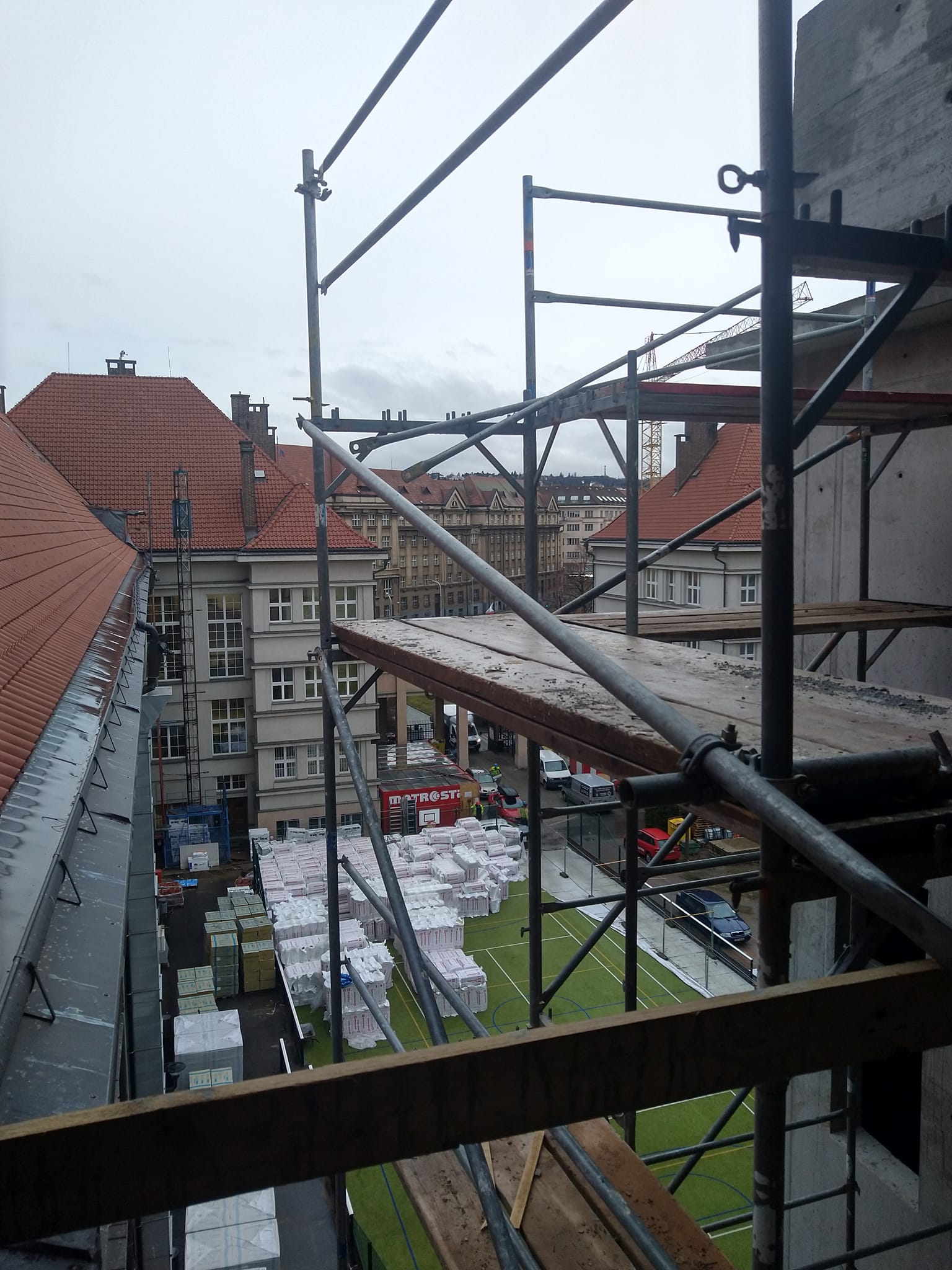 20. 1. 2022 Hrubá stavba schodišťových věží je dokončena. Připravuje se výstavba prosklené výtahové šachty. Prostor podkroví je rozčleněn příčkami na jednotlivé místnosti, provádějí se stropy. Jsou dokončeny hlavní trasy inženýrských sítí, tj. rozvody vzduchotechniky, vody, kanalizace, topení. V nižších podlažích škol se postupně vyměňují prosklené příčky za nové.